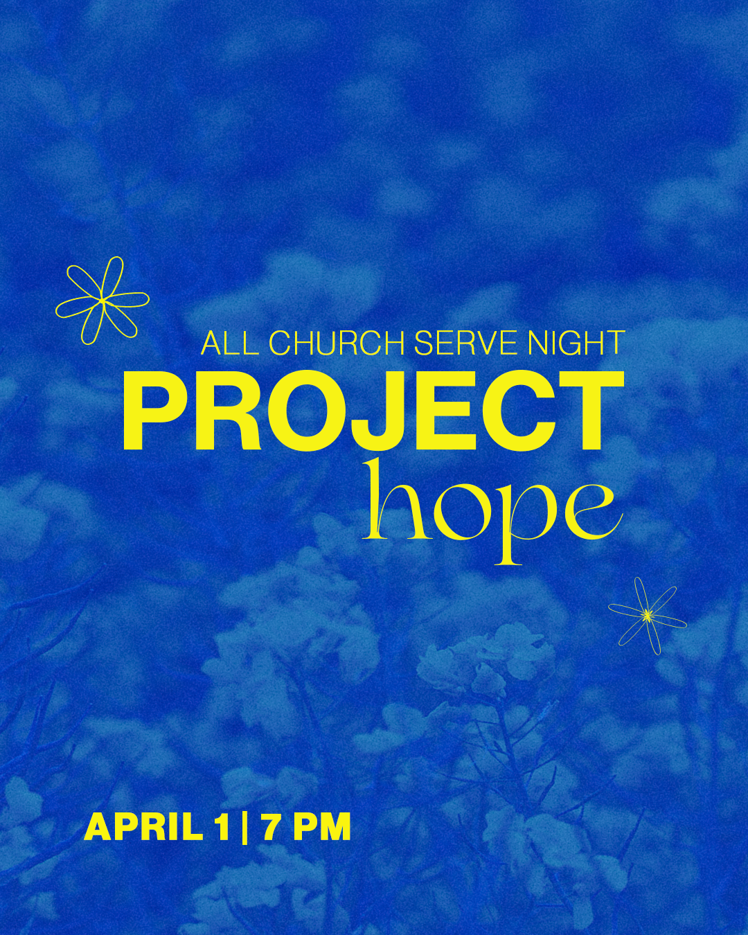 APRIL 1 | 7 PMProject Hope is our family friendly serve night where we gather to make a difference in our community. The evening begins with dinner at 6:15 PM and continues with serve projects at 7 PM.